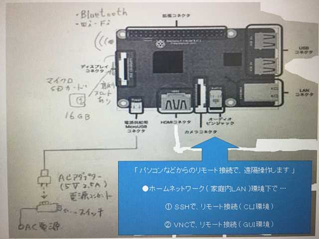 主な、機器類です。 ・Raspberry Pi3 Model B(ラズベリーパイスリーモデルビー) element14版 ・スイッチング ACアダプター 5V2.5A AD-B50P250 ・USBケーブル Aオス-マイクロBオス 0.5m A-microB ・TOSHIBA マイクロSDカード(micro SDHC) EXCERIA 16GB 100MB/s ・電源スイッチは、AC電源のスイッチを使用しています。 ・ディスプレイとHDMIケーブルは不要です。(リモート接続しますので)