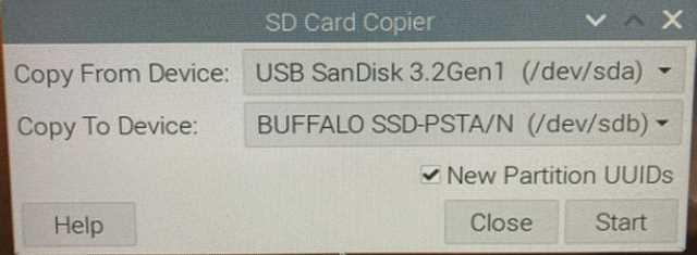 ●コピーする … デバイスを選択する。 ・Copy From Device : コピー元 …【USB】のデバイスファイル名を指定する。 ・Copy To Device : コピー先 …【SSD】のデバイスファイル名を指定する。 □New Partition UUiDs … チェックを入れます。*新しいパーティション