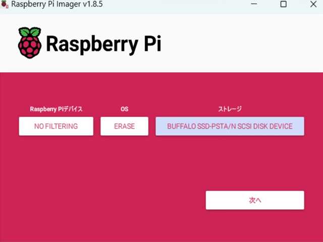 ●「 Raspberry Pi Imager 」機能を使用しての初期化です。 ・デバイスを選択 : No filtering ・OSを選択 : ERASE ・ストレージを選択 : 該当のSSD