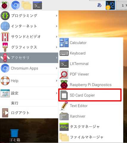 ●タスクバー(左端)のメニューアイコンから、「SD Card Copier」を起動します。 【 アクセサリ 】 → 【 SD Card Copier 】