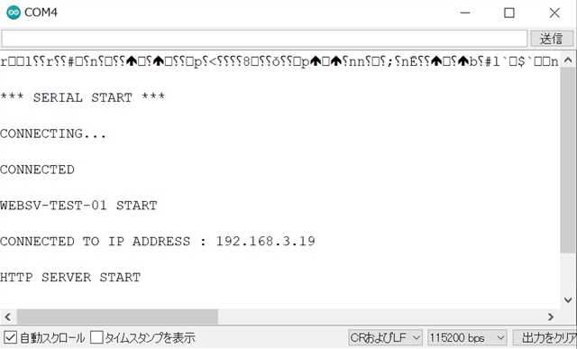 ●簡易Webサーバー が、立ち上がった直後で ……… シリアルモニタに、ログが出力された状態です。