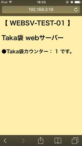 ●感想 自宅 Wi-Fiルータ の 家庭内無線 LAN 環境下で ……… ・Webサーバーを立てることができました。 ・スマホ( iphoon ) ブラウザからアクセスできました。 ・Webサーバー内のカウンタ更新ができました。 お手軽に、簡易Webサーバーを立てることができました。 (^^)