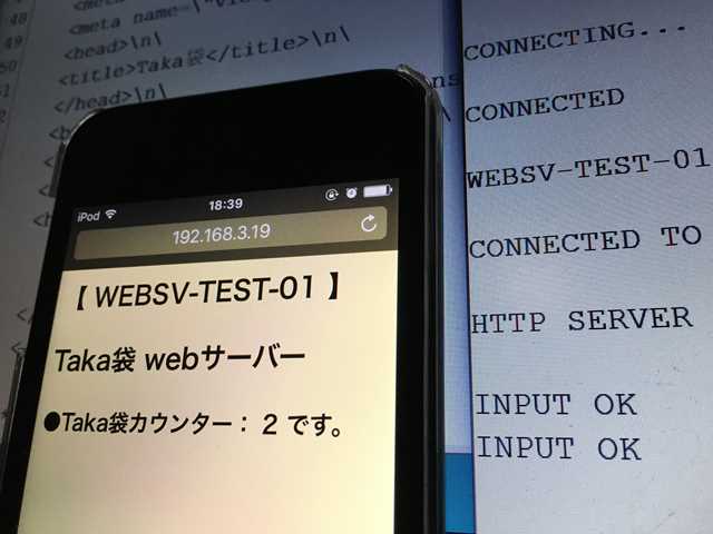 ●実験概要です ■ESP-WROOM-02をステーションモード設定で起動させる。 ・家庭内無線 LAN 環境下で、簡易的なWebサーバーとして立ち上げる。 * IPアドレスは、Wi-Fiルータで割り振られます。 ■Taka袋カウンター(ESP-WROOM-02格納)を設置する。 ・Wi-Fiルータで割り振られたIPアドレスで スマホ(ブラウザ)などからアクセスできます。 ・ページ更新すれば、Taka袋カウンターがUPします。