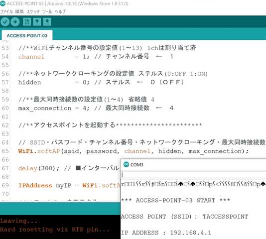 //******************************************************** //●Wi-Fiルータ(アクセスポイント)処理B プログラム // ESP02マイコン(Arduino): ACCESS-POINT-03.ino //-------------------------------------------------------- //■アクセスポイントとなる… // 簡易的なイントラネット用の「自作ルーターもどき」に // 組み込むWi-Fiルータ機能プログラムです。 // ・Wi-FiルータのIPアドレス( http://192.168.4.1/ )デフォルト //******************************************************** //■【当該ESP02】Wi-Fiルータ //・アクセスポイント ( SSID ) : TACCESSPOINT //・クライアントIPアドレス : 自動割り振り…動的(ダイナミック) // 可変IPアドレス ( http://192.168.4.X/ )を割り振る。 //-------------------------------------------------------- //■クライアント ( http://192.168.4.X/ ) // IPアドレス : Wi-Fiルータで自動的に割り当てされたもの //******************************************************** //●ライブラリ使用する ヘッダファイルのインクルード //******************************************************** #include <ESP8266WiFi.h>; // Wi-Fi通信 //******************************************************** //●グローバル変数(定数)の設定 //******************************************************** //** アクセスする SSID と パスワードなどの各設定 String ssid = ""; // SSID(最大63桁) String password = ""; // パスワード(最小8桁) int channel = 0; // WiFiチャンネル番号 int hidden = 0; // ネットワーククローキング int max_connection = 0; // 最大同時接続数
