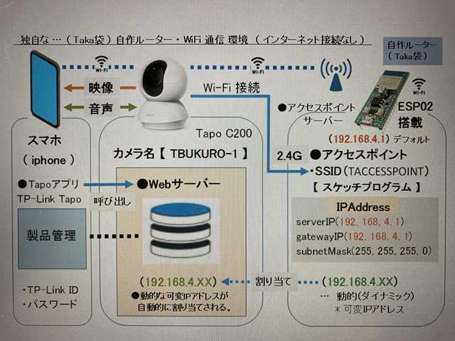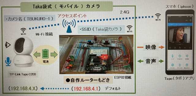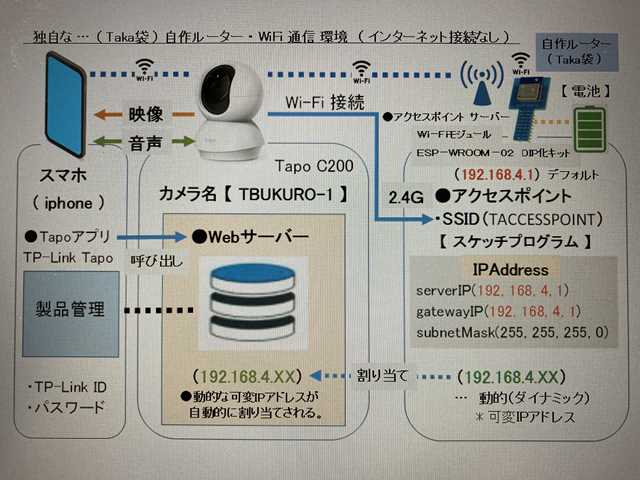 ・ ●モバイル的な、電池駆動の構成で接続してみます。 ・ ・ ■電池駆動 … 自作ルーターもどき ・ ・ ■電池駆動 … クライアント機器( ネットワークカメラ )