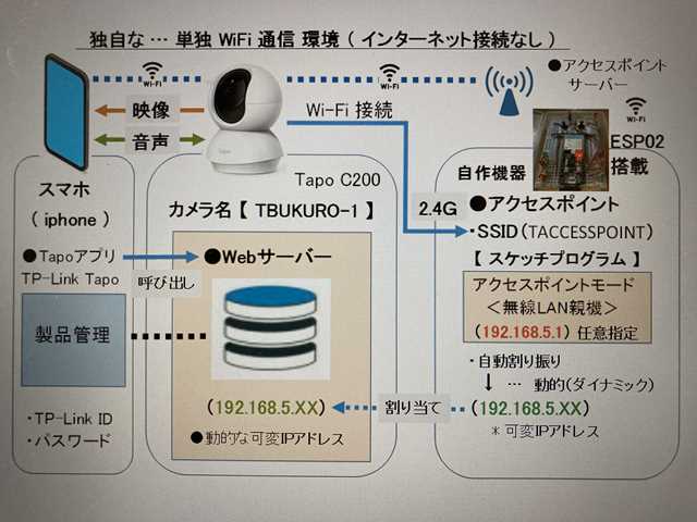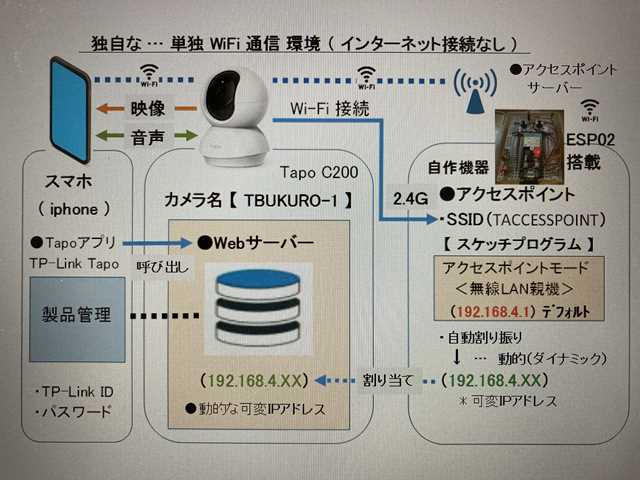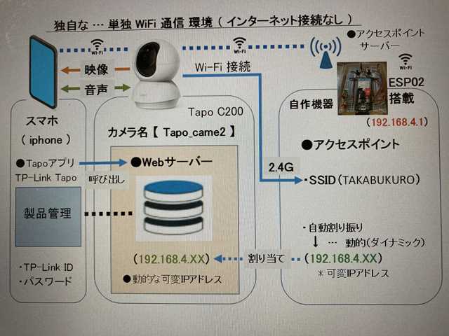 ●接続概要 ・独自な … 単独iFi通信環境下で、通信処理を行ないます。 ・自作機器( ESP02搭載 )を経由して、映像を表示させます。 ■アクセスポイント 自作機器で、設定している SSID( TAKABUKURO ) ■IPアドレス( Tapo C200 ) 自作機器( ESP02搭載 )で、動的に自動割り振りされた 可変IPアドレスを使用して、動かしてみます。
