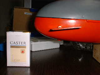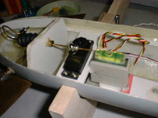 ■船体を浮上姿勢にした状態である(下の写真) 潜舵が、船体を潜航方向の軌道に乗せようと、 自動制御されている。 ・浮上姿勢の傾き度に合わせて、潜舵が、その傾き度分だけ潜航方向に向く動作をする。 → 潜舵の最大角度は、ニユートラル(水平状態)から15度に設定されている。 ・プロポ(送信機)からのコントロールが優先されており、この時は、潜舵の最大角度は、 15度以上のサーボ・フル・ストロークである。(使用サーボのノーマル仕様通り)