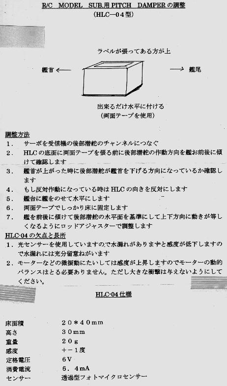 オートピッチコントロール(Auto Pitch Control)を略して、’ピッチコン’とも言われている。 ●簡単に言えば・・・水平走行維持装置である。 艦首の上下縦方向に振る動きである’ピッチング(縦ゆれ)’を、水平走行軌道に維持できるように、 潜舵を自動的に、制御してくれるユニットである。 ●そのユニットは・・・故障もなく、安定している 【HLC−04型】です。 光センサーを使用しており、船体の(潜航/浮上の傾き度)を検知して、水平走行維持できるように潜舵を 自動的に制御してくれる。これに伴い、走行が滑らかになりプロポからのコントロールもしやすくなる。 この【HLC−04型】は、±15度のサーボストロークになるよう調整されており両側制御である。 開発背景として、水深50cmのコンクリートの底に、RC潜水艦の最下部(腹)がこする為、 なんとかRC潜水艦のピッチング幅を、少しでも小さくしようと考え、実際のフィールドから生まれたもの であるので、私をはじめ、搭載している皆さんの評判も良く、高性能RC潜水艦の多くが搭載しています。 ●問い合わせ先 ・HONN MODEL CRAFT (ホーンモデルクラフト) ・E-mail : yusio573@feel.ocn.ne.jp ●サーボに接続された状態です。 『おやしお−F』に、初めて搭載しました。コンパクトサイズですね ↓